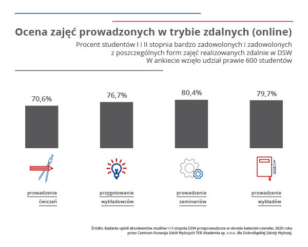 We checked whether, also from the student’s perspective, the whole process went smoothly. Almost 600 students took part in a survey in which we asked them to evaluate the academic and administrative services at the University of Lower Silesia. We are very pleased that as many as 82.9% of them are very satisfied or satisfied with the measures taken by DSW University during the coronavirus pandemic. Lectures, practicals, the lecturers' professional preparation and the work of the service departments were all rated highly.