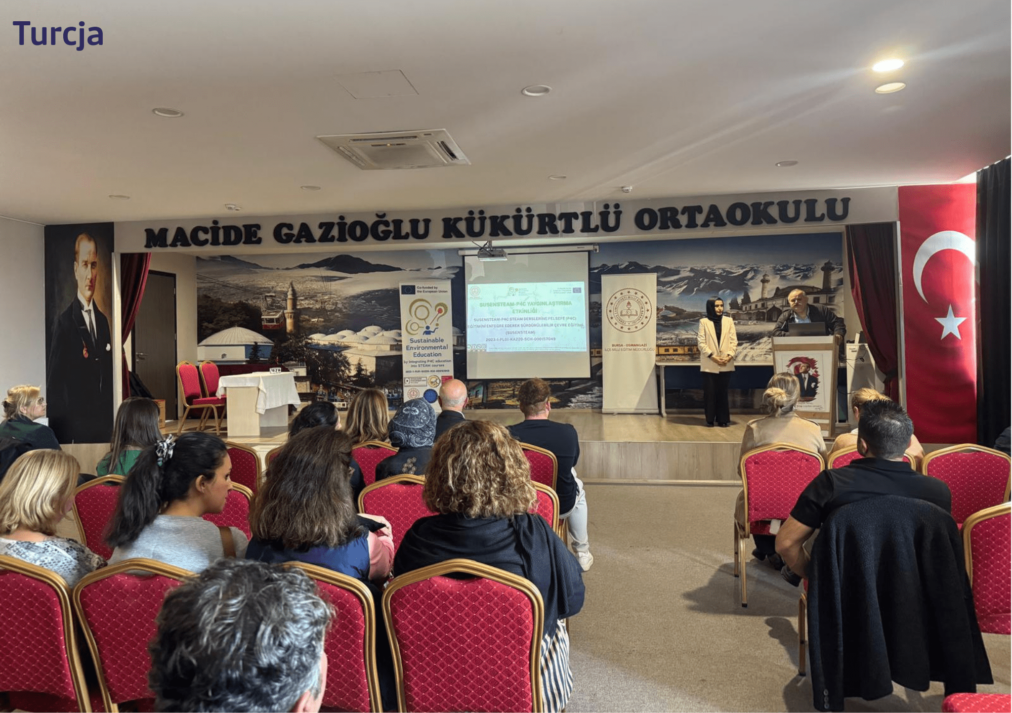 W Turcji wydarzenie promujące projekt zorganizowały OMEM i Uniwersytet Uludağ. Wydarzenie odbyło się w szkole średniej Macide Gazioğlu i zgromadziło 72 nauczycieli, którzy mieli okazję wysłuchać prezentacji na temat projektu i poznać możliwości praktycznego wykorzystania opracowanych materiałów. Uczestnicy zapoznali się z kursem online dotyczącym integracji P4C i STEAM, platformą cyfrową zawierającą bazę opowiadań P4C, ramami kompetencji przewidzianych dla dzieci w wieku 10–14 lat w obszarze edukacji środowiskowej, zajęciami pozalekcyjnymi promującymi zrównoważony rozwój oraz bazą dobrych praktyk w zakresie wykorzystania P4C i STEAM w klasie.