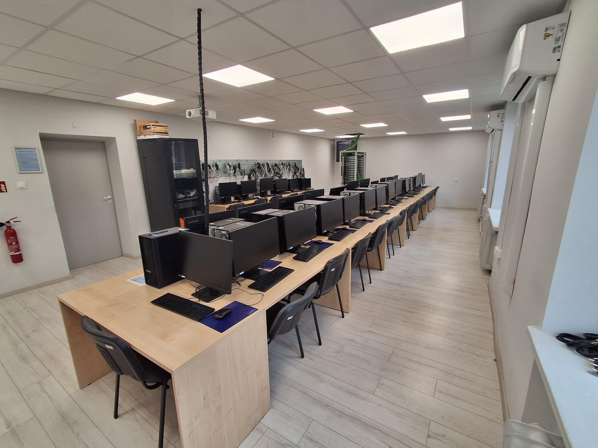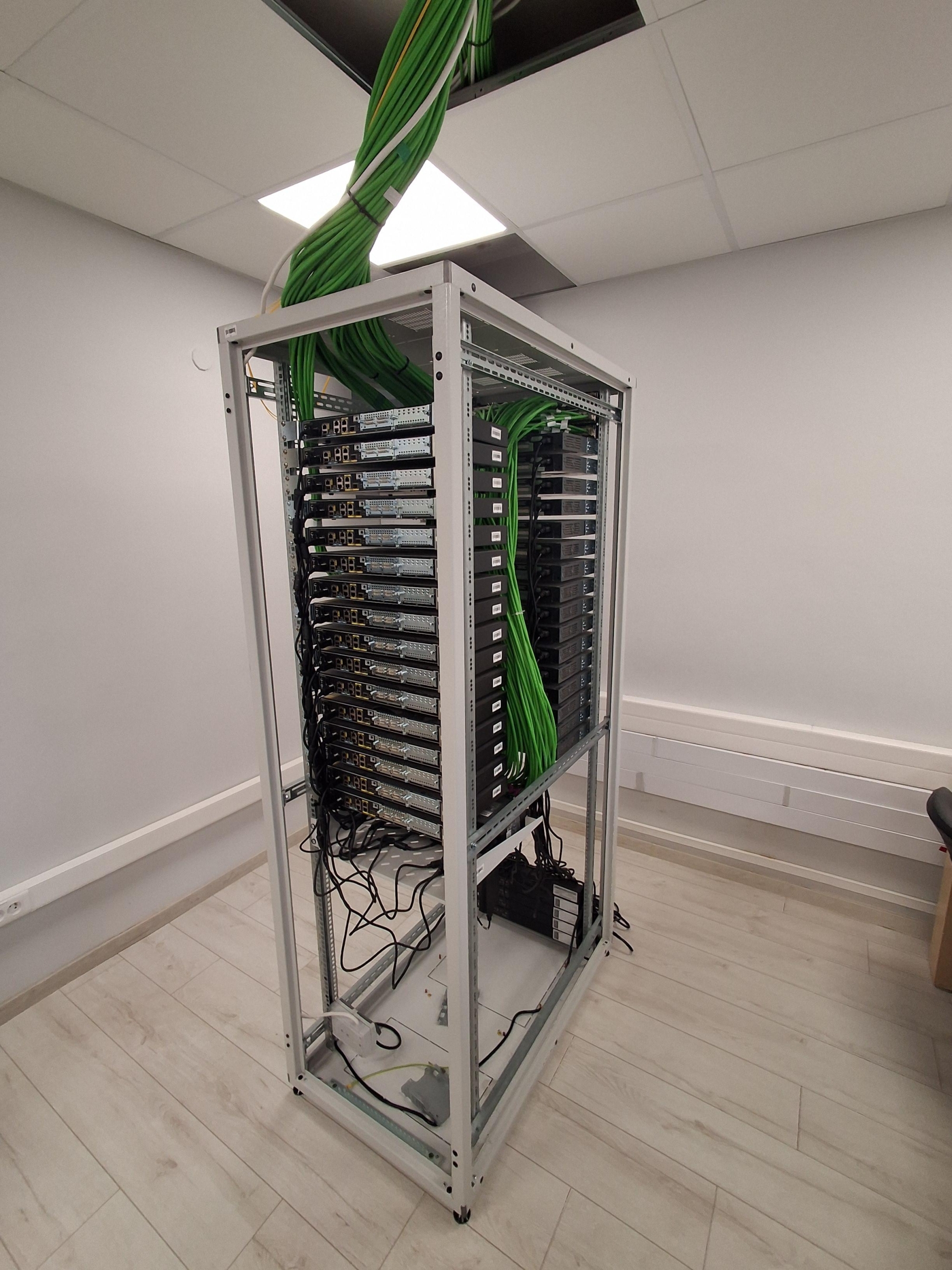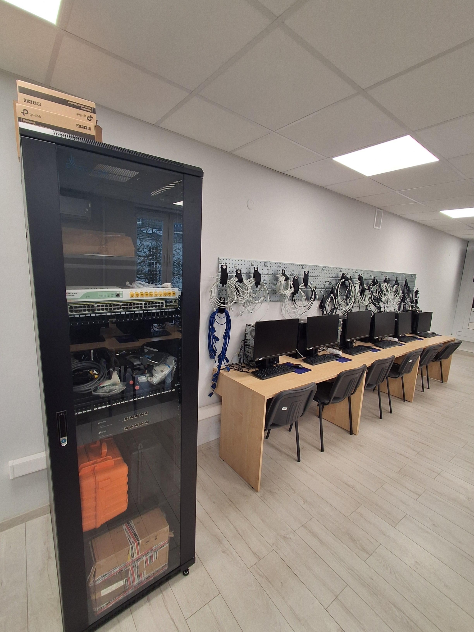 Wyposażenie: komputery, przełączniki, routery i niezbędny sprzęt marki CISCO do nauki zagadnień z zakresu sieci komputerowych i cyberbezpieczeństwa.